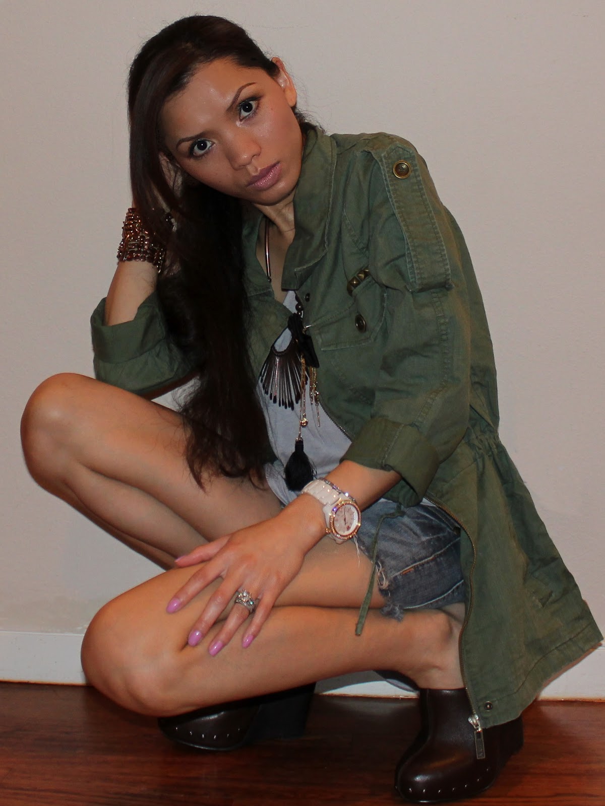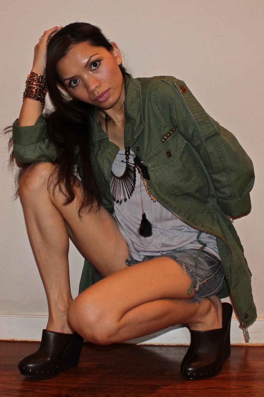 Gap Military Jacket, BDG Tank Urban Outfitters, Zara Shorts, DVF Handbag, Michael Kors Juniper Platform Sandals, Tom Ford Sundglasses, Free People Cuff, Vintage Necklace