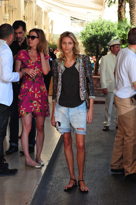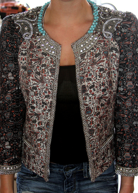 The Hadley Jacket is quilted and reversible. It has a western bandanna print in red and blue stars on the other side. It has a moto jacket cut and is priced at $505. The other Jacket is the July Jacket, it's embellished with crystal and turquoise beading and runs $2125. Model Anja Rubik is wearing it with boyfriend shorts in the first picture. These two pieces are available at V.O.D. Boutique.
