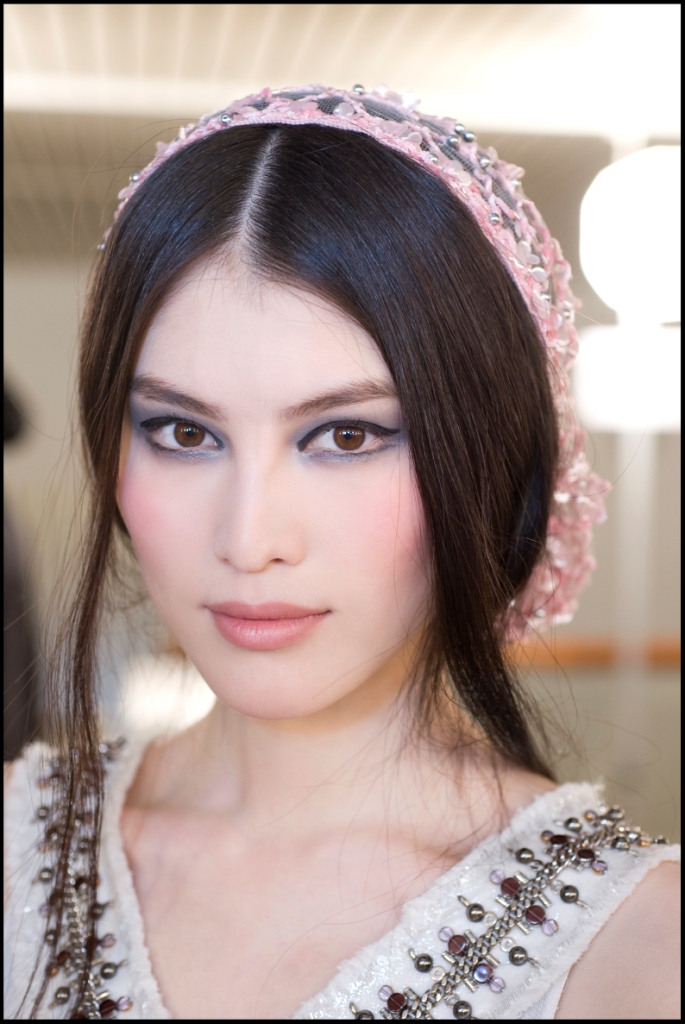 Starting with a clean base Peter creates a blue/gray metallic eye with CHANEL'S Ombre Essentielle Soft-Touch Eyeshadow in Furtif on the crease and underneath the lower lash. He applied a thick liner, CHANEL'S Inimitable Mascara in Black and used a Kohl Liner in Clair, a pale beige for the inner rims of eyes. CHANEL Joues Constraste Blush in Rose Intial was used on the apples of the cheeks. Peter creates a neutral lip to finish the face with Lip Liner Natural and Rouge Allure Lipstick in Evanescente.