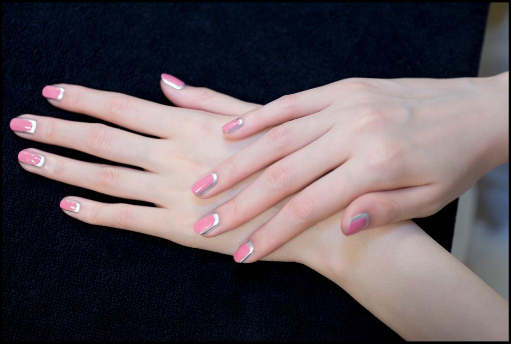 The modern French manicure was created using May, a melon polish from Spring 2012 show and the entire nail bed was outline in a chrome color rather than the tip.