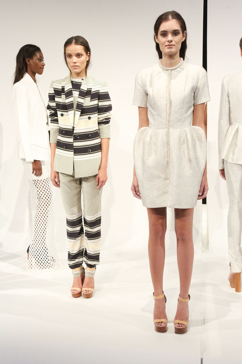 Kym Ellery's S/S13 Collection was beautiful, sculptured and tailored. Ellery continues to use metallic fabrics, sheers and sequined prints. This collection consisted of cream, white, silver, orange, gold, burgundy and black.
