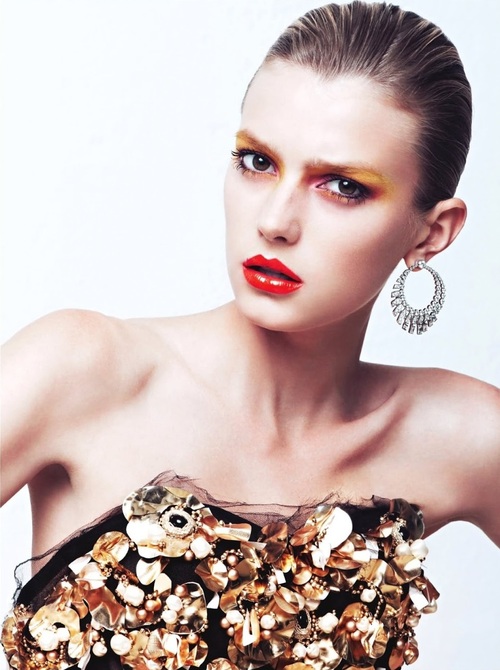 Katja Rahlwes photographs model Sigrid Agren in Numéro Magazine #138. Sigrid's makeup is colorful with bright lips and eye makeup.