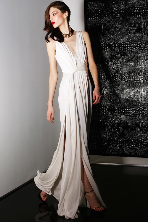 "It's all about sexy seduction," the designer says. The Pre-Fall 2013 Collection consist of draped jersey, leather and chiffon. Geometric shapes with a chevron motif are found on a pointelle knit top and evening gown.