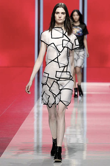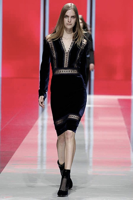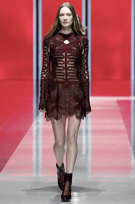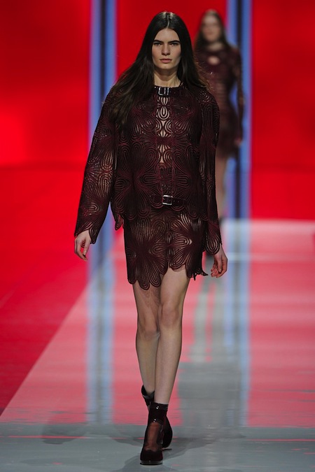 Christopher Kane's Fall 2013 Collection was artful with a nod to his Scottish heritage. The garments included kilts with a modern twist. His interest in Frankenstein also surfaced with ragged velvet dresses and coats with deconstruction. His use of guipure lace and tulle was beautifully mastered.