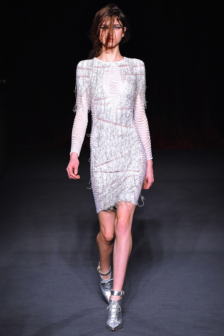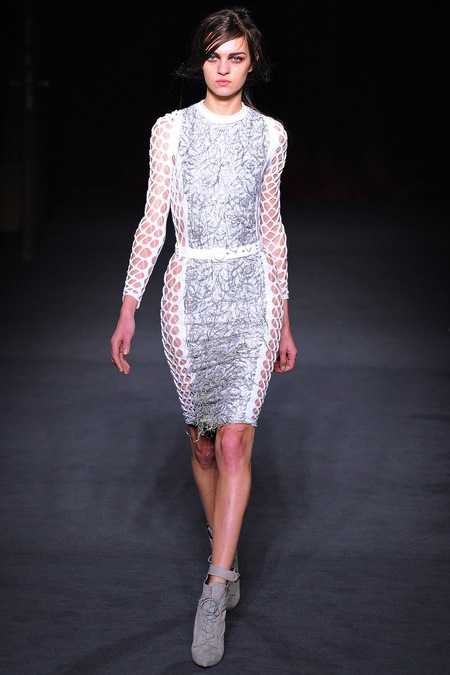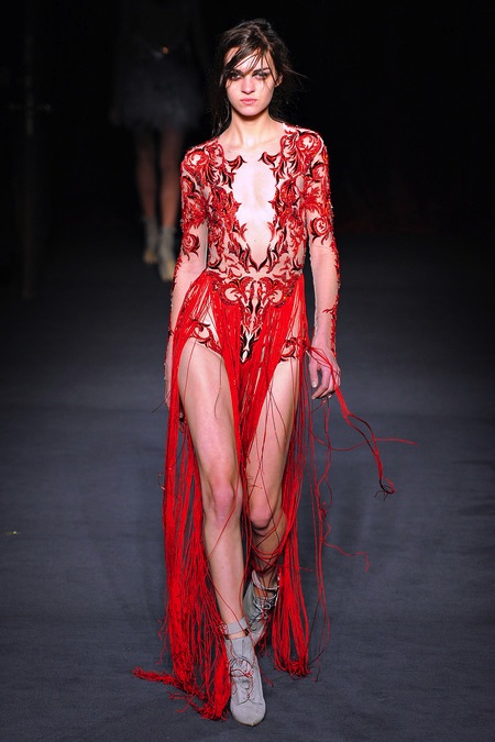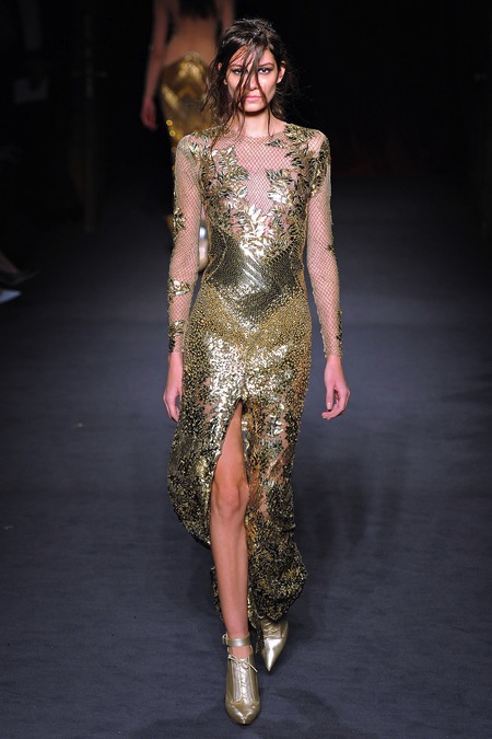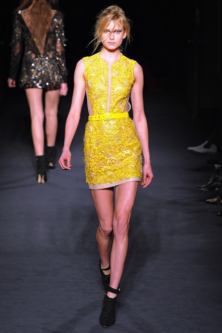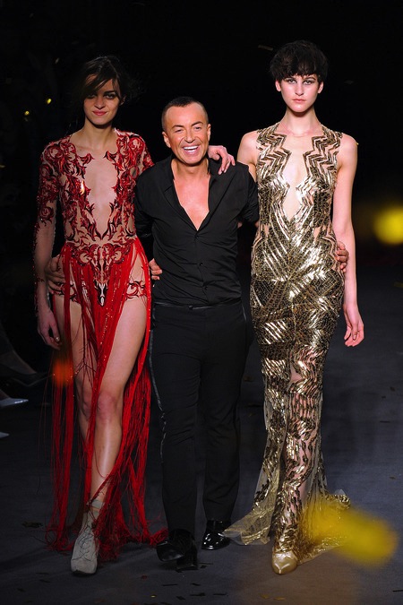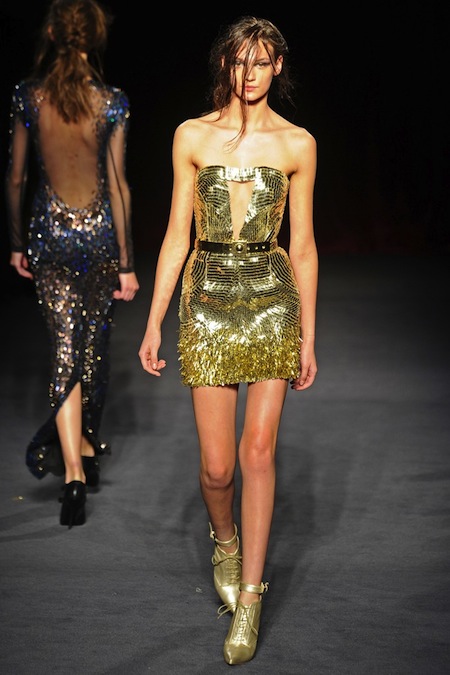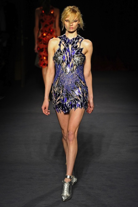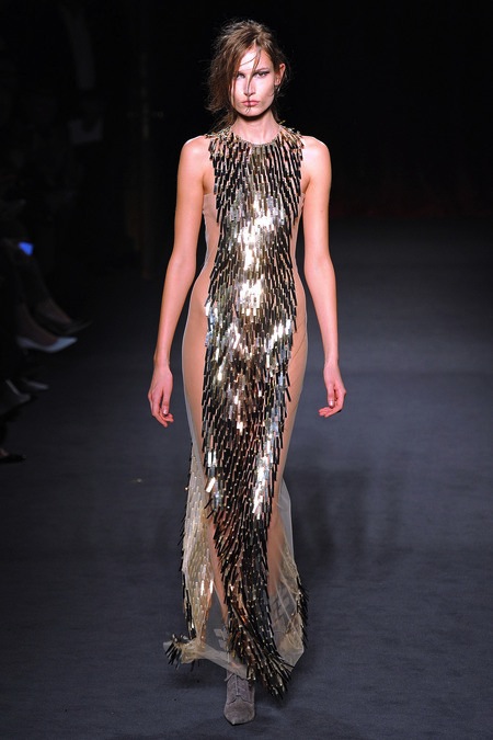 Julien Macdonald's Fall/Winter 2013 was sleek, sexy and glamorous. It consisted of sequined mini dresses to red carpet ready gowns in a sultry mix of gunmetal, gold, silver, red, blue, yellow, creme and black.