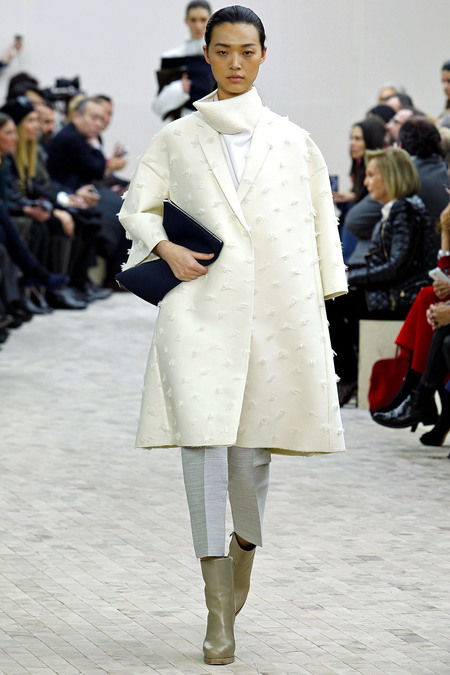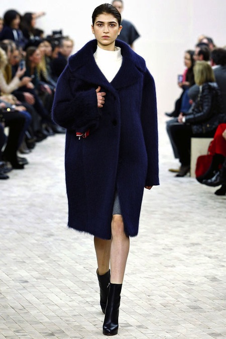 Phoebe Philo created a chic and elegant FALL/WINTER 2013 Collection for CÉLINE. The collection consisted of coats, dresses, pants and skirts in muted tones. The silhouettes were figure flattering for all shapes. The color palette consisted of grays, cream, browns, navy, green and pale pink.