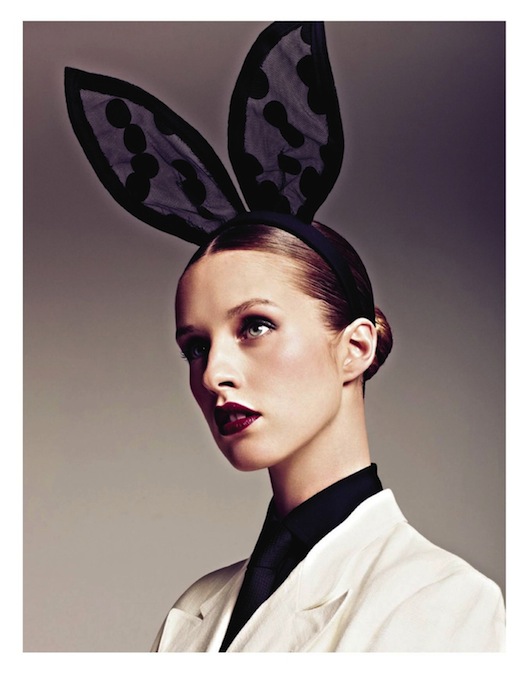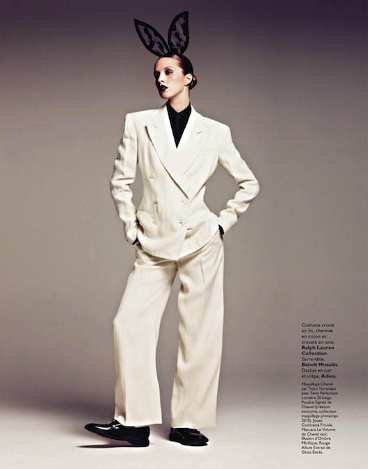 James Macari photographs Julia Frauche in the editorial "NOIR & BLANC" for GRAZIA France's March 2013 issue. Teddy Czopp styles Julia in designs by Prada, Ralph Lauren Collection, BALMAIN, LOUIS VUITTON, Paul & Joe, Moschino, Isabel Marant, Dsquared² and Victoria Beckham. Maxime Mace and Tatsu Yamanaka create the hair and makeup looks.