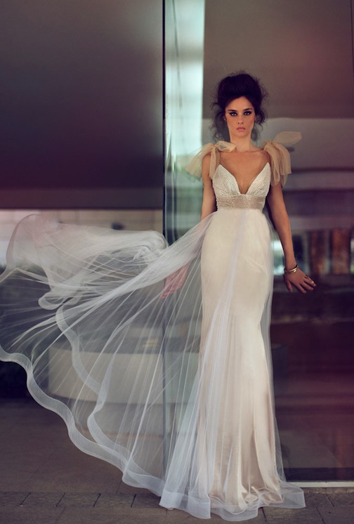 Zahavit Tshuba's bridal gowns are delicately made with beautiful sheer fabrics, lace and crystal. The line is inspired by the designers lifestyle and experiences. The collection has old Hollywood glamour but with a modern twist.