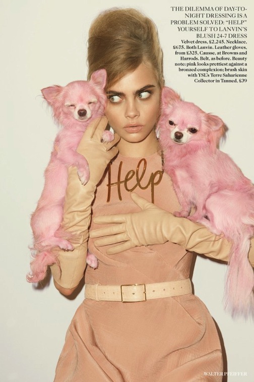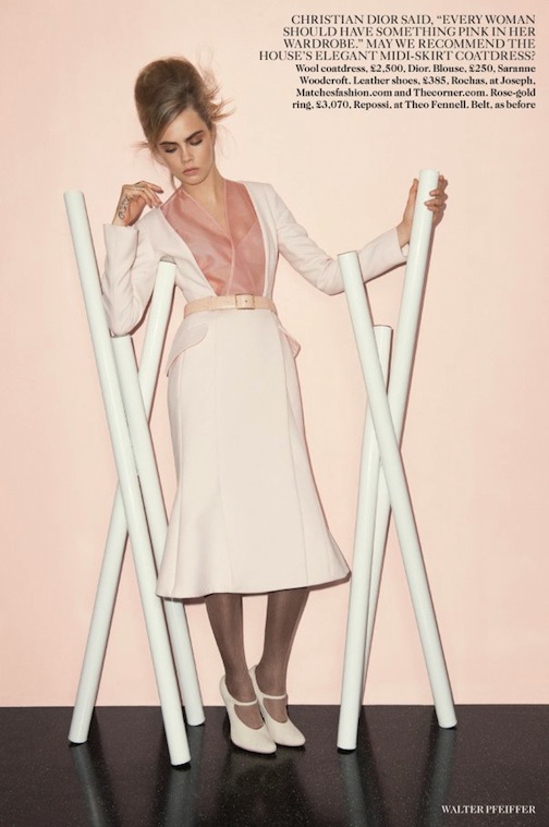 Cara Delevingne by Walter Pfeiffer for VOGUE UK, SEPTEMBER 2013 in "pink lady". Francesca Burns styles Cara in Miu Miu, Dior, Rochas, JW Anderson, Comme des Garçons, Prada, Céline, Marc Jacobs, Repossi, Gucci, Lanvin, Fendi and Balenciaga.