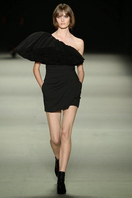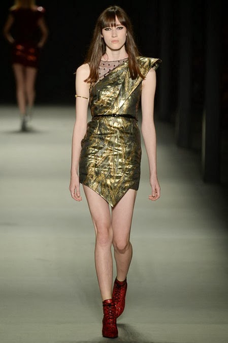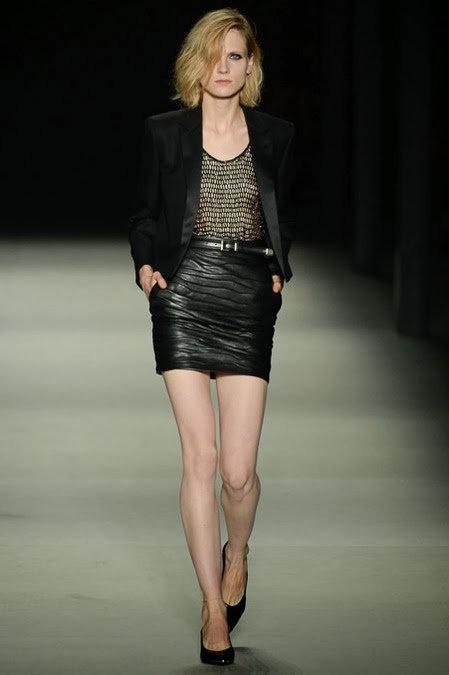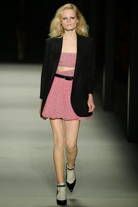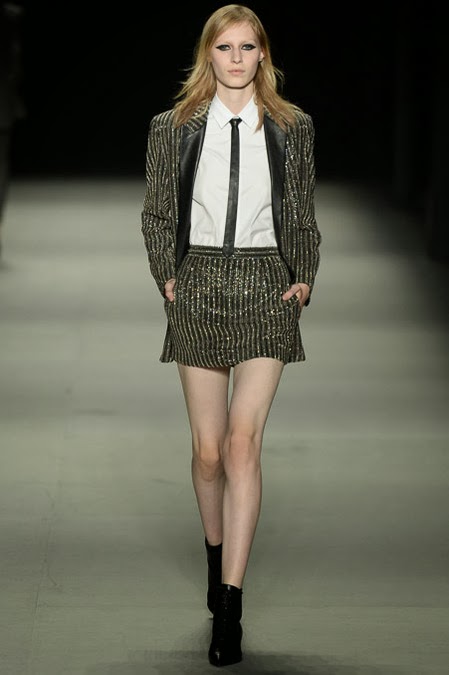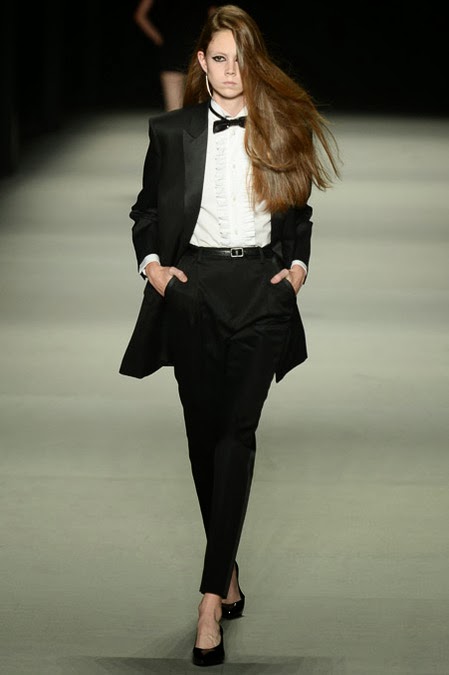 Hedi Slimane brings a feminine/masculine twist to SAINT LAURENT's S/S 2014 COLLECTION. The dresses had asymmetrical silhouettes and the fabrics had lots of sheen.