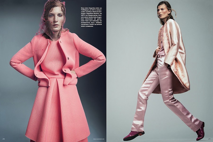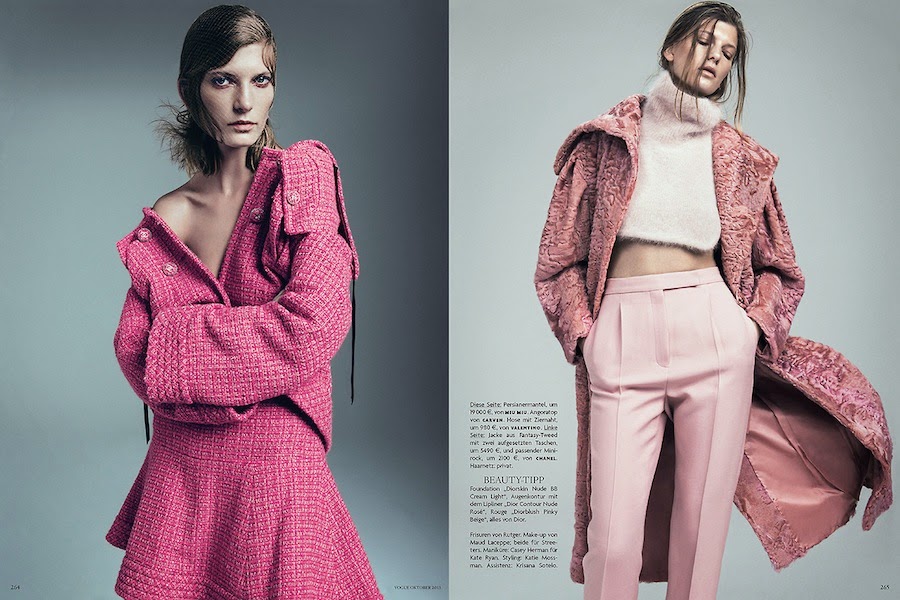 Valerija Kelava by Sebastian Kim for VOGUE GERMANY, OCTOBER 2013 in "COOL PINK". Katie Mossman styles Valerija in MIU MIU, CARVEN, VALENTINO, CHANEL, MARC JACOBS, GIAMBATTISTA VALLI, TOM FORD, PRADA, GUY LAROCHE, HELLIANTHUS, SIMONE ROCHA, ATTILIO GIUSTI LEOMBRUHI, VIKTOR & ROLF, SAINT LAURENT BY HEDI SLIMANE, ACNE, MARNI and BALMAIN.