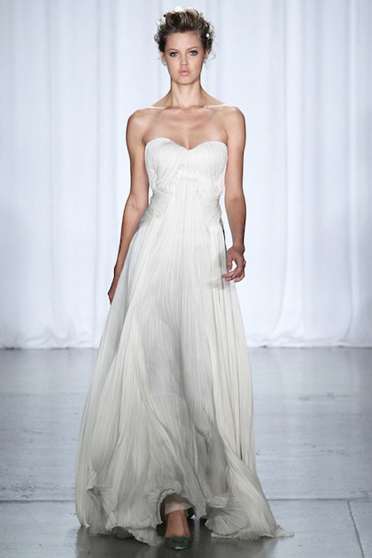 Zac Posen's S/S 2014 Collection has a mixture of long and short hemlines. His craftsmanship and detail sewn by hand are apparent with the pleated and knotted fabrics. The silohuettes are feminine and form fitting.