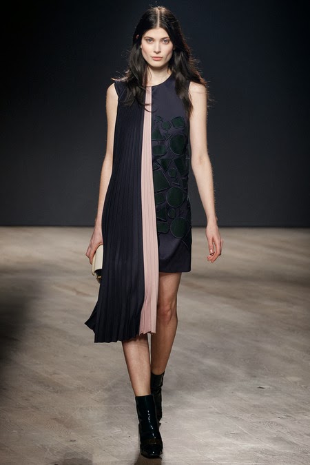 Mary Katrantzou's Fall/Winter 2014 collection displayed intricate details. The pieces were created with lace, pleats, brocades, appliqués and chainmail. The collection was inspired by Mary's surroundings which include signs, colors and uniforms.