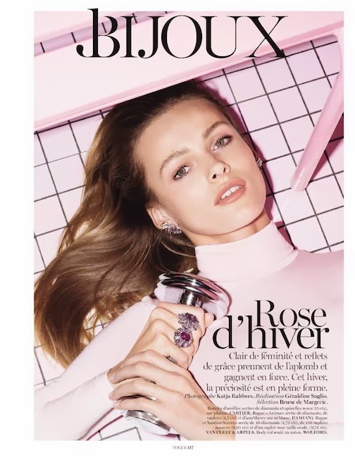 Edita Vilkeviciute by Katja Rahlwes for VOGUE PARIS, FEBRUARY 2014 in "Rose d'hiver". Géraldine Saglio styles Edita in CARTIER, DAMIANI, VAN CLEEF & ARPELS, WOLFORD, ADLER, CHAUMET, REPETTO, BALMAIN, DAVID YURMAN, BOUCHERON, PIAGET, CHAUMET and CHANEL.