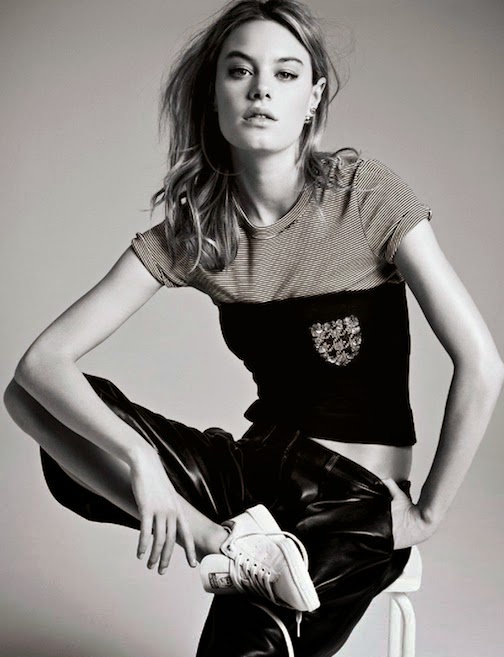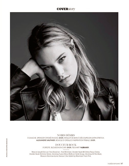 Camille Rowe by Christopher Meimoon for MADAME FIGARO, JUNE 2014 in "FRENCH FLOWER. Cécile Martin styled Camille in Dior, Yazbukey, Petit Bateau, Innamorato, Adidas, Alex Vauthier, Gap, Maison Martin Margiela, Sacai and Levi's.