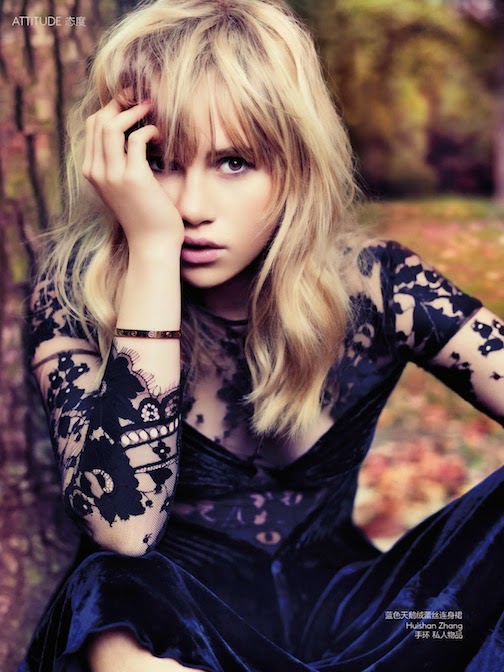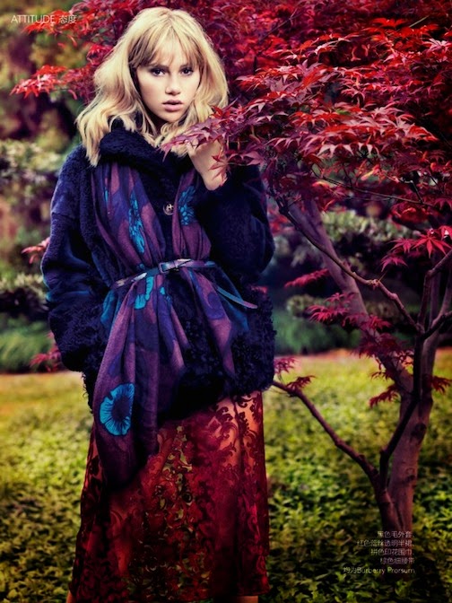 Suki Waterhouse by Stockton Johnson for VOGUE CHINA, AUGUST 2014 in "Suki Waterhouse - Walking on clouds". Candy Lee syled Suki in Burberry Prorsum, Huishan Zhang, Cheng, and Christian Louboutin.