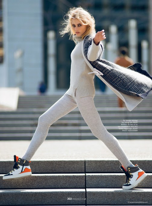 Vika Falileeva by Benjamin Kanarek for ELLE Vietnam, November 2014 in "The Comfort Zone". Mélanie Brault styled Vika in Suecomma Bonnie, Chanel, Yiqing Yin, Equipment, Pierre-Louis Mascia, Azzedine Alaïa, Balenciaga, American Apparel, Paule Ka, Barbara Bui, Agnes B, Iro, Max Mara, Vanessa Bruno, Jean Paul Gaultier, Vivienne Westwood, A. F. Vandervorst, JC de Castelbajac, Acne Studios and Kenzo.