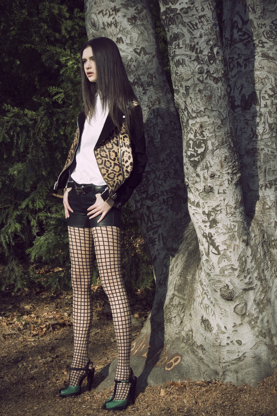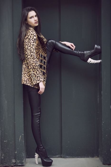 Model Iana is rocking the Luxirare Leopard Print Calf Hide Peacoat with D-Squared Thigh High Spine Boots.
