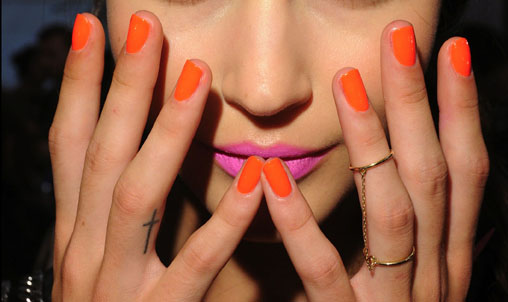 Bright orange nails were seen on the runway for S/S 2012. The first picture is from Milly by Michelle Smith Spring 2012 Collection. The models wore CND's Electric Orange. I listed some other possible shades to try for this S/S as well.