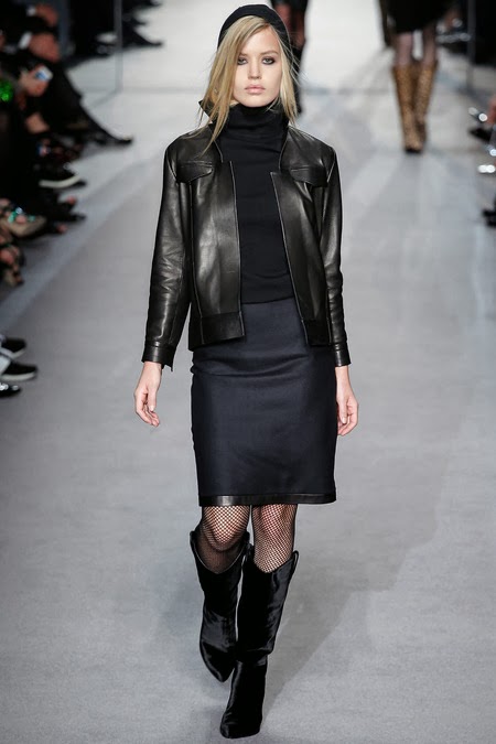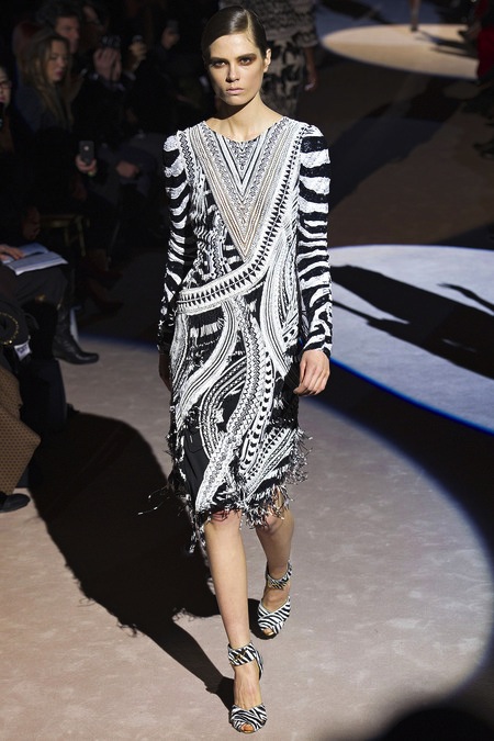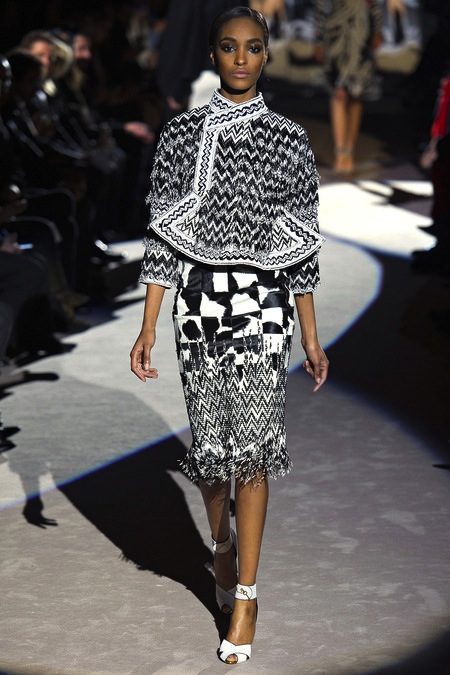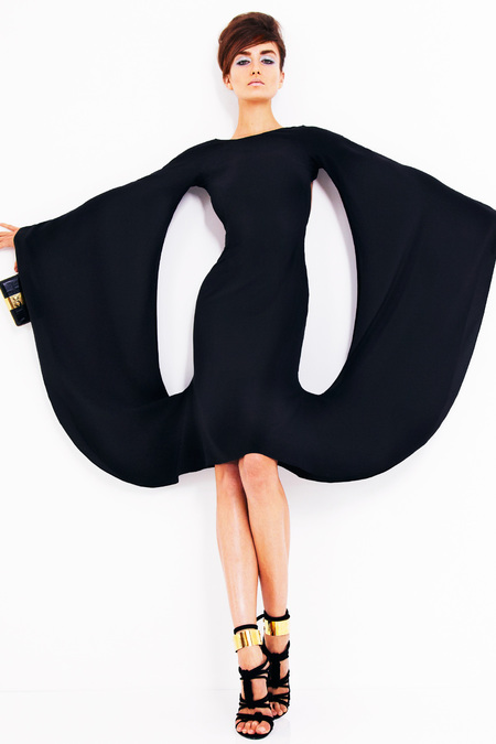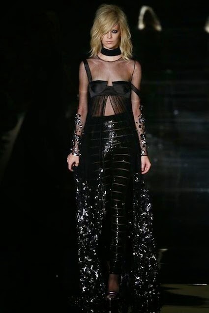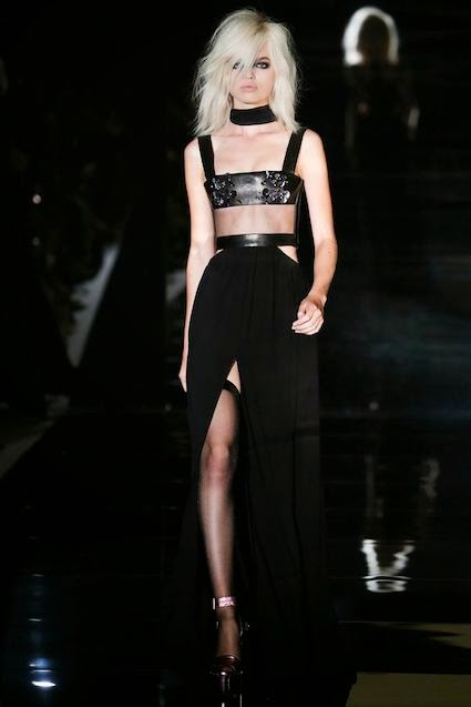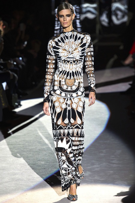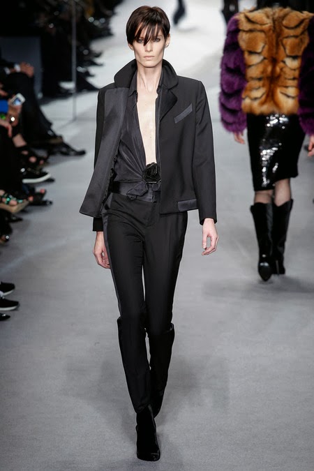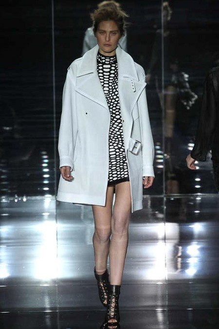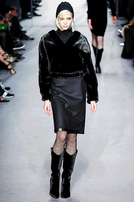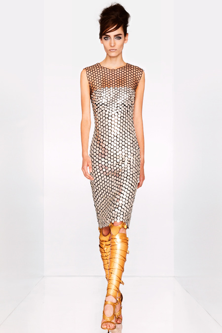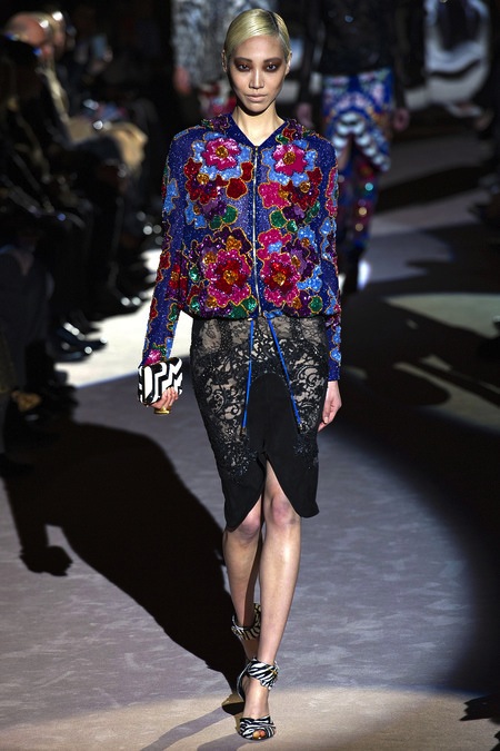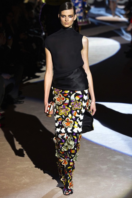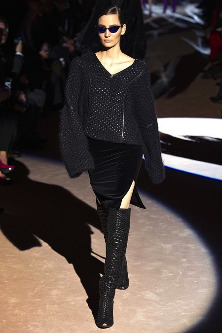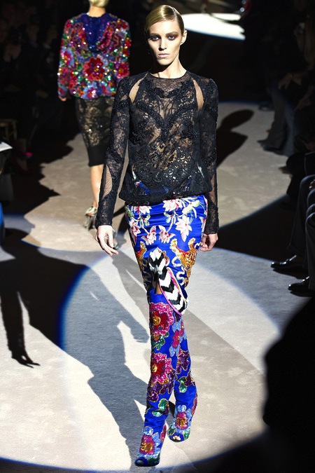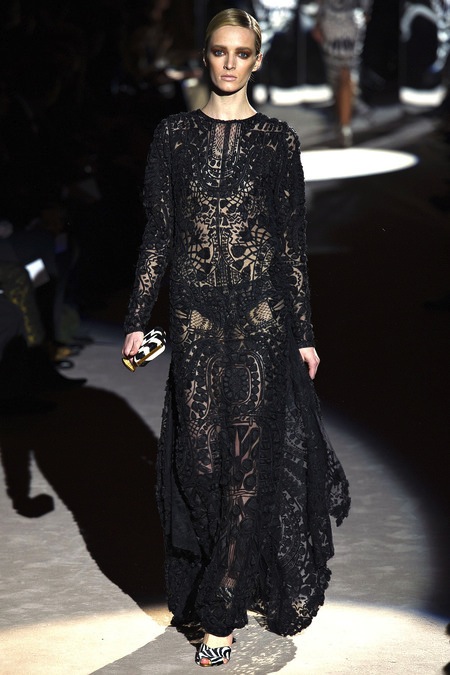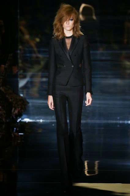 Tom Ford's Collection had a grand, almost theatrical gesture. The pieces were form fitting and in bright shades of red and yellow. Black was prominent in this collection as well as grey,white and gold. He also used exotic skin/scales. Snake and crocodile were broken down to their component scales and applied to stretch jersey to create tops, dresses and full-length sheaths.